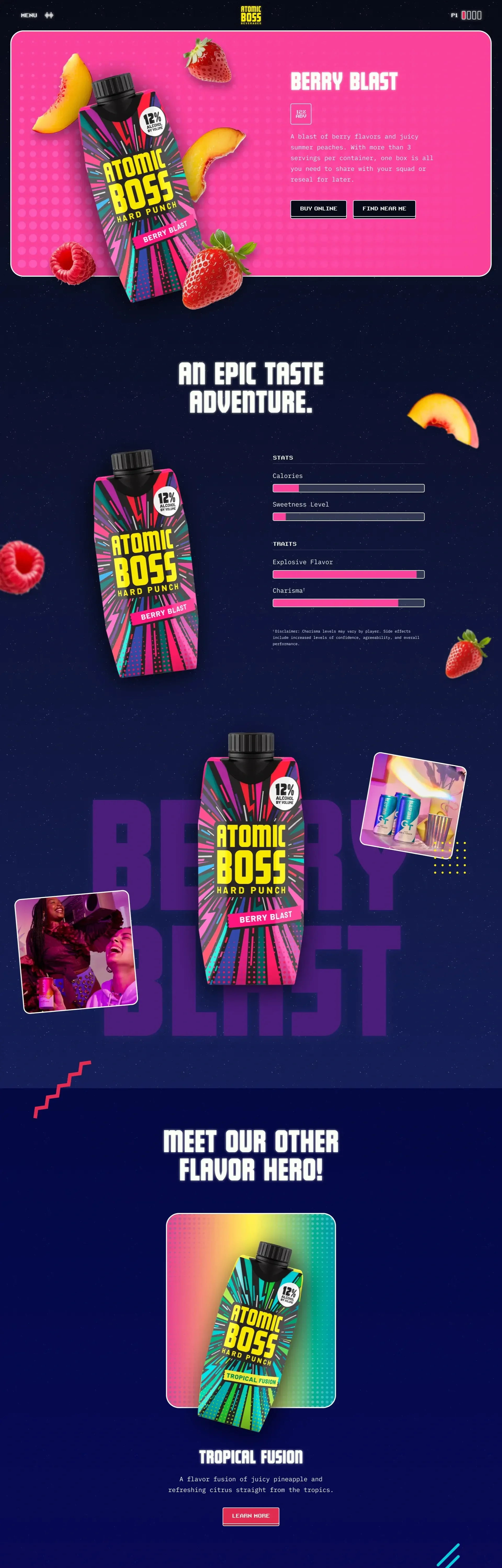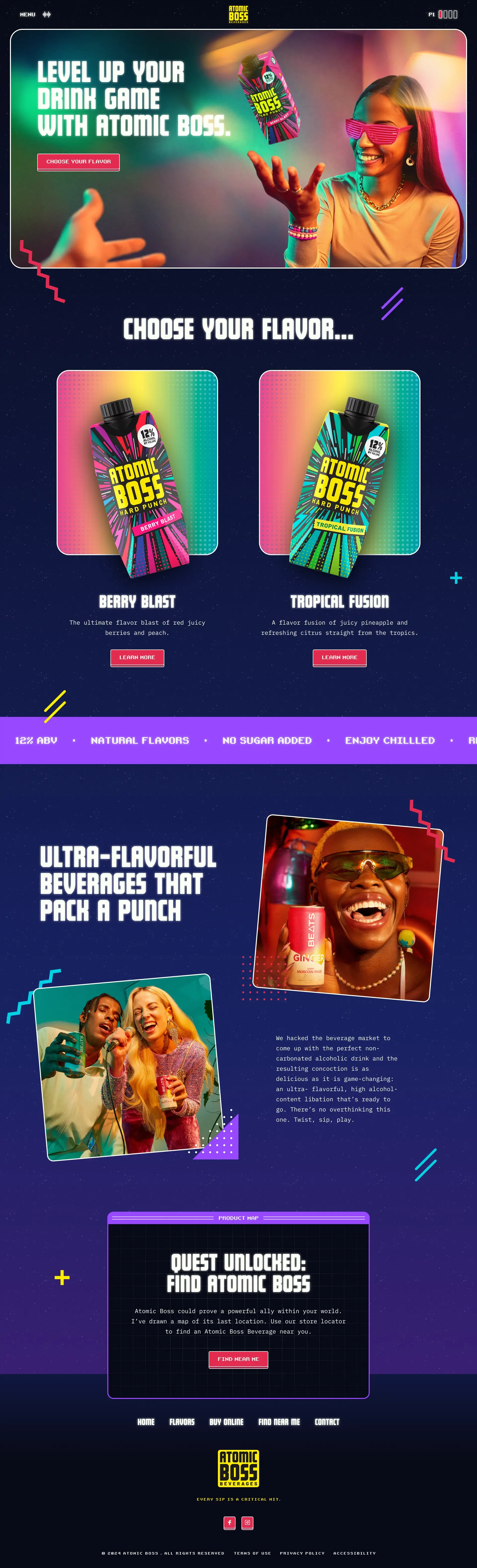 As soon as you enter the world of Atomic Boss, you’re transported into a pixel-perfect world that creates nostalgia and gamer vibes. Leaning into the arcade and RPG energy, you immediately know that this Boss means business. Every design element tells a story that this brand isn’t here to blend in—it’s here to take over the party, delivering a critical hit with every sip.