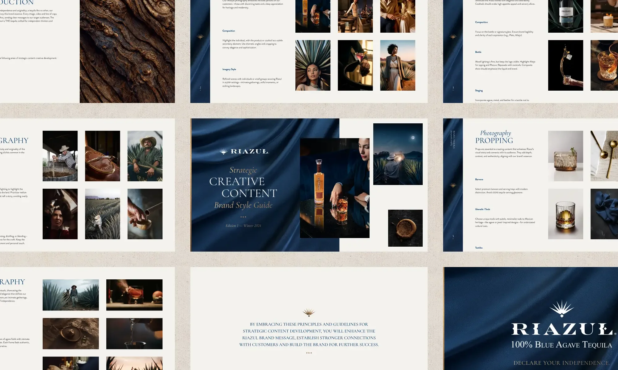 I created a visual content strategy built to define how the Riazul brand should show up across photography and video. The deck establishes a cohesive direction for lifestyle imagery, product shots, producer and process documentation, propping standards, and videography guidance. Each section was crafted to ensure the brand’s premium character comes through with clarity and consistency, grounding Riazul’s future content in a refined, authentic visual language.